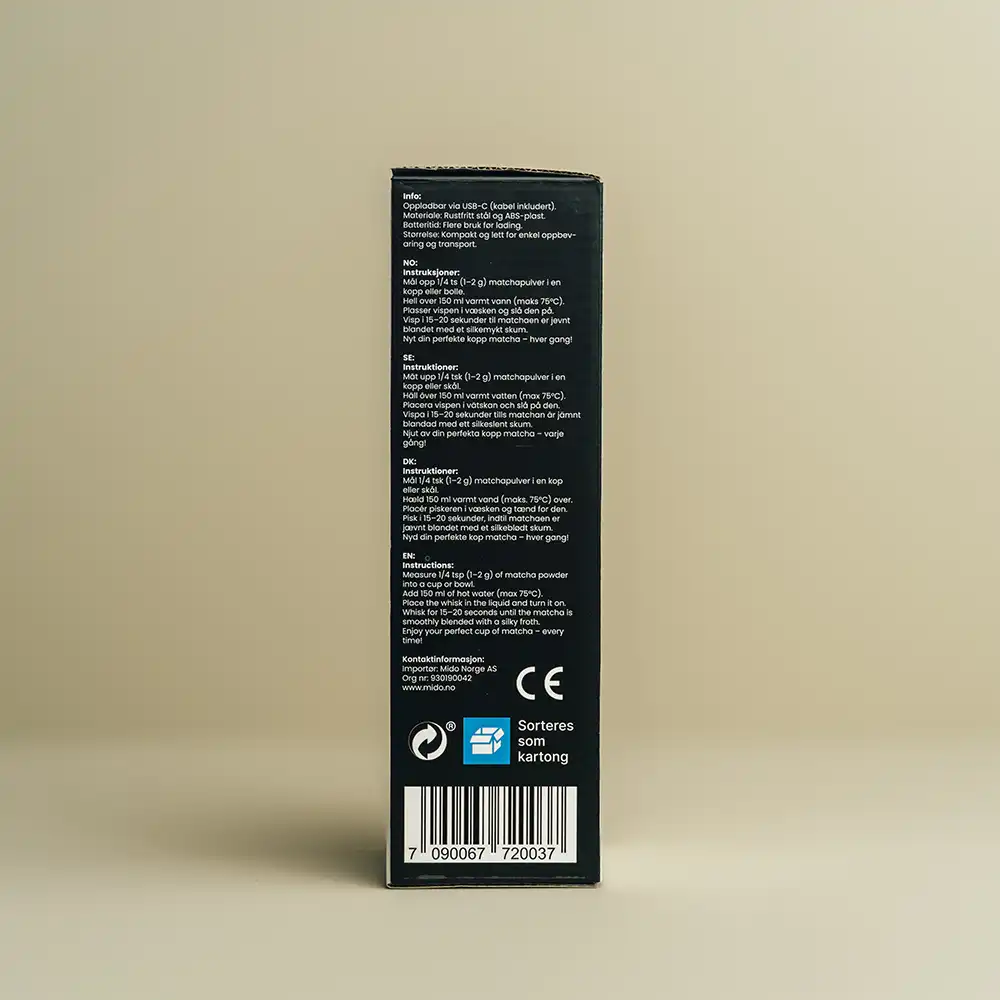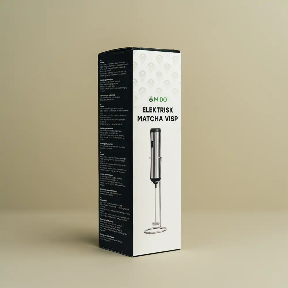 Les om vår matchaLag en silkemyk og klumpfri matcha te eller matcha latte på sekunder! Mido Elektrisk Visp blander matchaen jevnt og effektivt med ett enkelt knappetrykk – ingen bambusvisp nødvendig. Perfekt for både varme og kalde drikker, hjemme eller på farten.