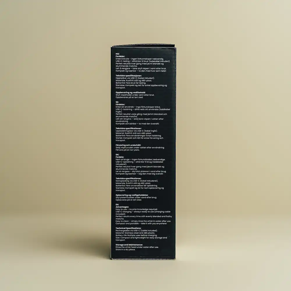 Med USB-C-lading og et kompakt design er denne vispen perfekt både hjemme og på farten. Bare tilsett matcha og vann eller melk, trykk på knappen, og få en silkemyk drikk på sekunder!